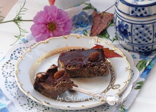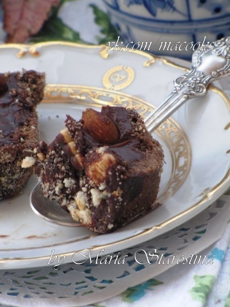 В блендере измельчим в мелкую крошку половину фундука и миндаля вместе с печеньем (6 штук) и растопленным сливочным маслом. У меня было печенье типа крекера с шоколадом, но можно взять любое бисквитное или затяжное.