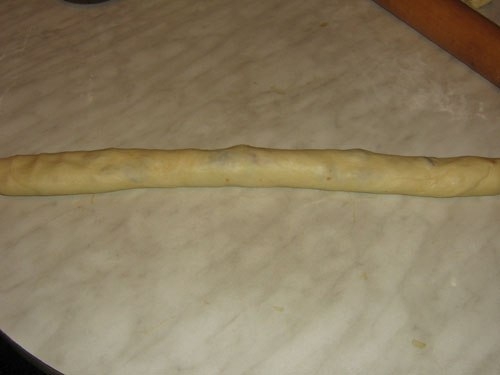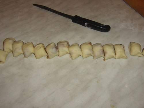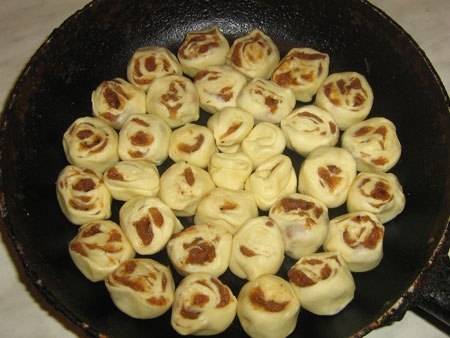 укладываем густое повидло в классическом беспорядке. Скручиваем рулетом. Нарезаем кусочками. Защипываем с низу каждый кусочек и укладываем в форму смазанную растительным маслом.