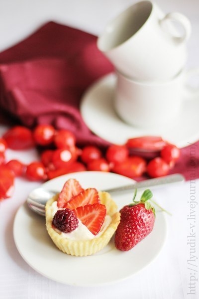 И завершающий аккорд, когда наконец настает черед клубники! Выбираем небольшие ягоды более правильной формы, моем, нарезаем пластиками и украшаем пирожные. Дополнительно можно использовать любые другие ягоды: малину, голубику, ежевику...