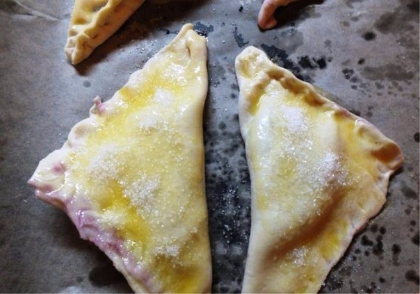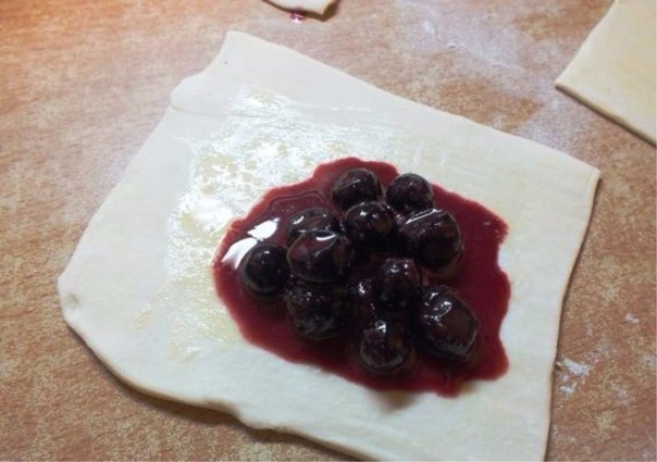 2. Раскатайте тесто и вырежьте из него квадраты. Можно взять готовое тесто, либо приготовить самостоятельно. Серединку квадрата смажьте взбитым яйцом, посыпьте сахаром и на половину положите немного смородины.