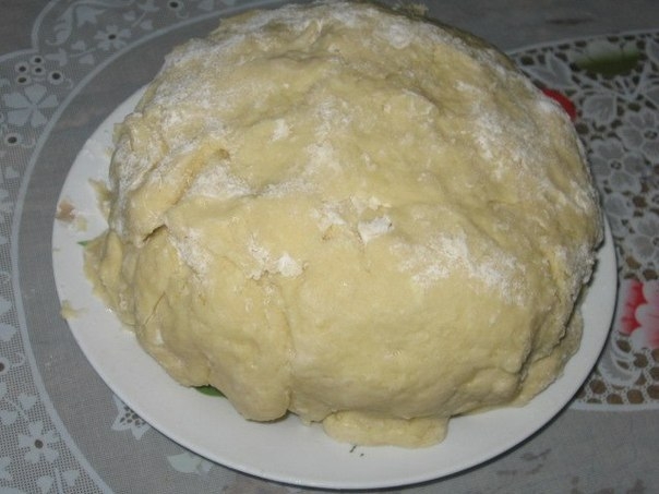 3.Тесто получается эластичным и мягким. Накроем его и поставим в холодильник. Холодное тесто будет лучше прокручиваться на мясорубке.