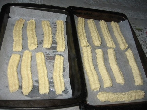 4.Приготовим противни. Застелем их пергаментом и смажем маслом. Пришлось доставать старую ручную мясорубку. Выбираем насадку и крутим печенье любой длины и конфигурации.