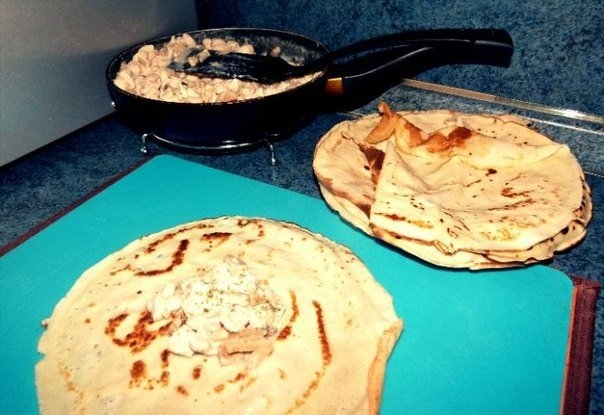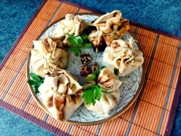 3. На центр блинчика положите 3 ложки жульена, соберите в виде мешочка, завяжите зеленым луком.