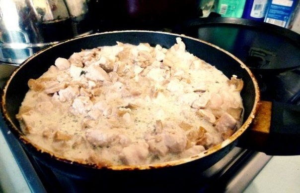 2. Куриное филе и грибы нарежьте мелкой соломкой, обжарьте на масле до готовности, добавьте maggi для жульена (можно сделать соус самостоятельно, в этом случае вместо maggi добавьте сливки, соль, перец). Тушите еще минут 5, до загустения соуса.