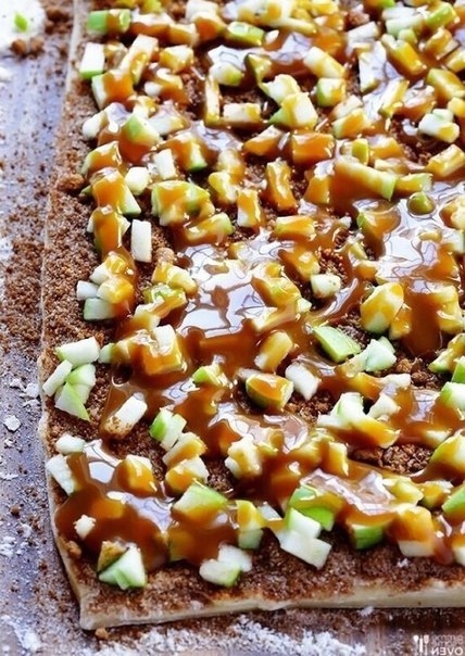 Затем посыпать мелко нарезанными яблоками и сбрызнуть 1/2 стакана карамельного соуса.