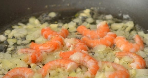Добавить очищенные креветки. Готовить 2-3 минуты.