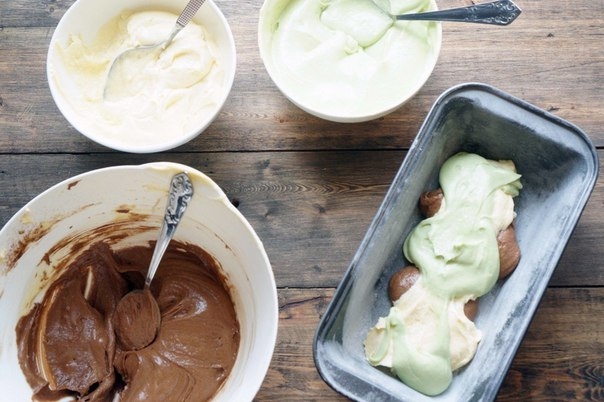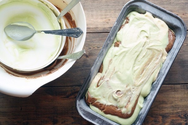 Я решил совместить рецепт хорошего кекса и забытую технологию «Зебры». Вы удивитесь, как хорошо получается сочетание таких разных и ярких вкусов — шоколадная прослойка, зелёная с чаем матча и более нейтральная белая.