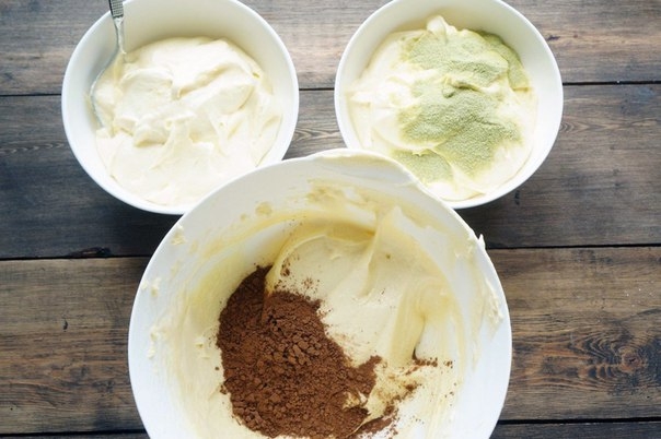 Затем разделите массу на три части по мискам. Я больше люблю шоколад — поэтому у меня было примерно 2/4+1/4+1/4. Всыпьте в одну матчу (2 ч.л.), в другую какао (2 ст.л.).