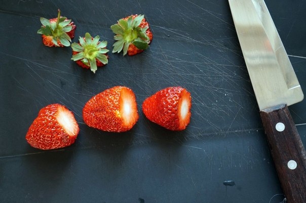 Пока он размокает, готовим ягоды: моем и режем крупные. Я обрезал у клубники хвостики, делая ровную площадку, чуть позже я объясню, зачем.