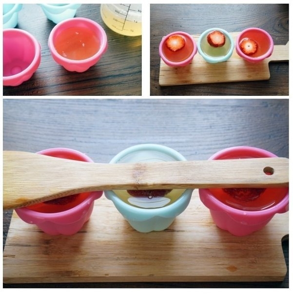 Ягоды всплывают на поверхность. Поскольку клубника у меня была крупная (входила одна в форму) то я хотел, чтобы ягодки красиво стояли в желе. Для этого я срезал небольшие площадки и сверху накрыл лопаткой. Так ягода зафиксировалась в нужном положении горизонтально и вертикально.