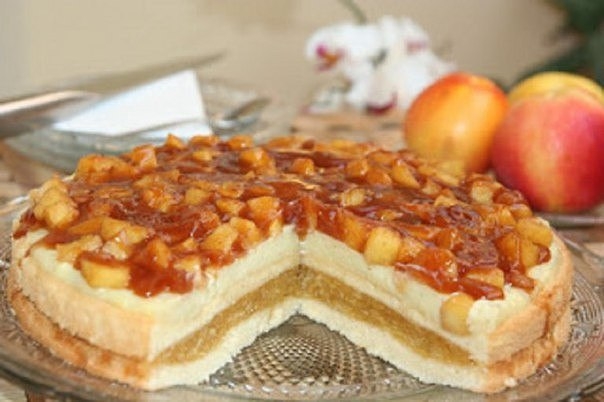 Оставшийся сок размешайте с бесцветным желатином и снова поставьте на маленький огонь. Глазурь должна вскипеть. После того как она немного остынет, до того как она полностью не загустела и ею было бы невозможно смазать верхний слой яблок, с помощью ложки начиная с середины торта к краям растяните желе. Это надо делать аккуратно, чтобы яблочное желе не стекало по краям. Поставьте готовый десерт в холодильник на 2 часа, чтобы он пропитался. По истечению этого времени торт можно подавать к столу.
