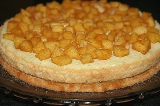 Глазурь: Очистите оставшиеся 2 яблока и нарежьте их кубиками. В кастрюлю налейте белое вино, добавьте корицу, лимонный сок, сахар и яблоки. Поставьте на маленький огонь и варите около 4 минут. Снимите кастрюлю с огня и ложкой достаньте яблоки укладывая их на пудинговый слой десерта.
