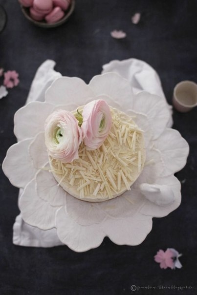 14. Перед подачей на стол украшаем малиновый чизкейк тертым белым шоколадом на большой терке и цветами ранункулюсами по желанию. Подаем на стол и удивляем гостей красивым и летним малиновым чизкейком с белым шоколадом и маскарпоне.