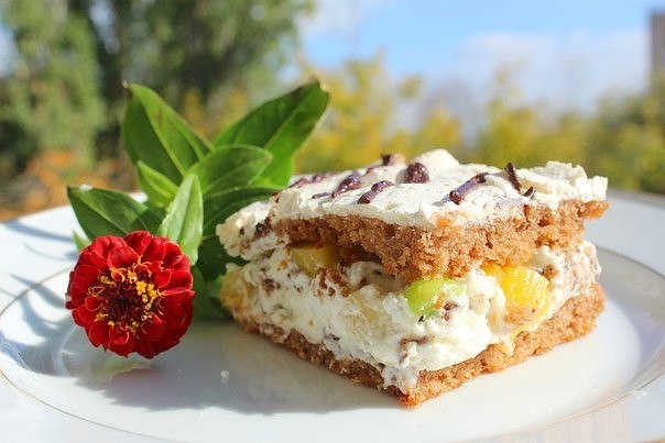 14. Выложить фрукты поверх сливок и накрыть другим пластом - слой безе наверху.