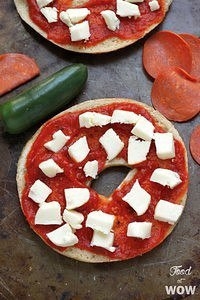 ★ Намазать соус для пиццы вокруг каждой стороны бублика.