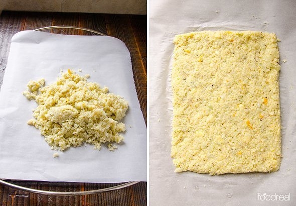 • Перекладываем смесь из цветной капусты на противень с пергаментной бумагой. Расплющиваем руками в прямоугольник.