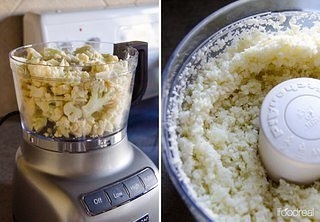 Разогреть духовку до 200 °С. Промойте цветную капусту, удалить внешние листья и разделить на соцветия. Кладем в кухонный комбайн, до рисовой текстуры.