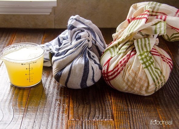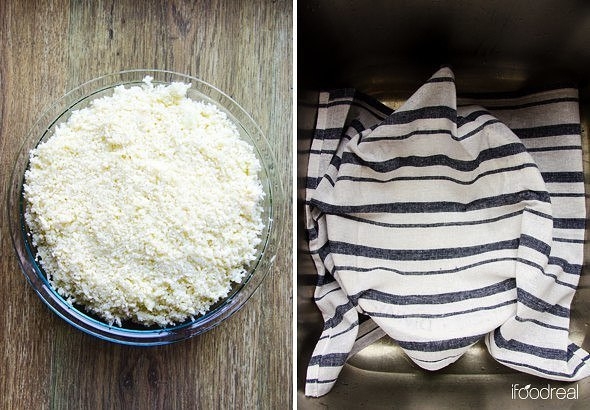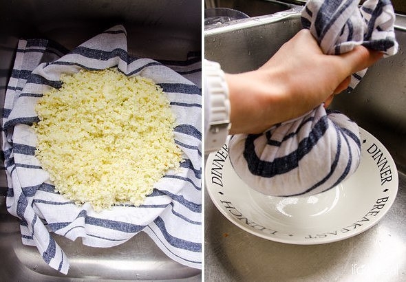 • Сложите полотенце, держа за концы и теперь ваша задача отжать жидкость из цветной капусты настолько, насколько сможете. Наберитесь терпения и проделайте это несколько раз, пока жидкость не перестанет выходить.