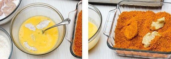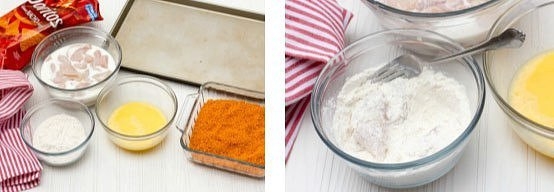 ▼ Подготовьте: 1. миска с курицей, 2. чаша с мукой, 3. миска со взбитыми яйцами, 4. миску с измельченными чипсами.