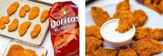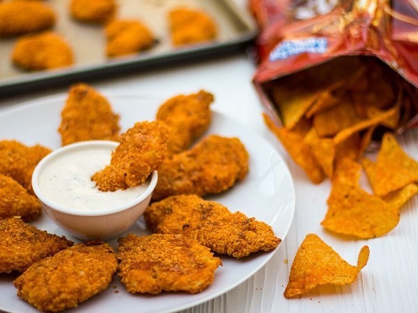▼ Используя вилку, поднимите куриные полоски и подождите, чтобы слились излишки пахты. Затем поместите курицу в муке, оберните с двух сторон, стряхните излишки. Далее поместите их в яйцо с двух сторон, а после - в измельченные чипсы. подготовленные кусочки кладем на противень.