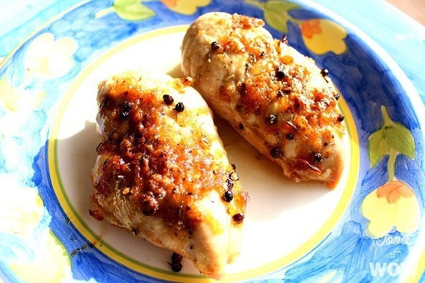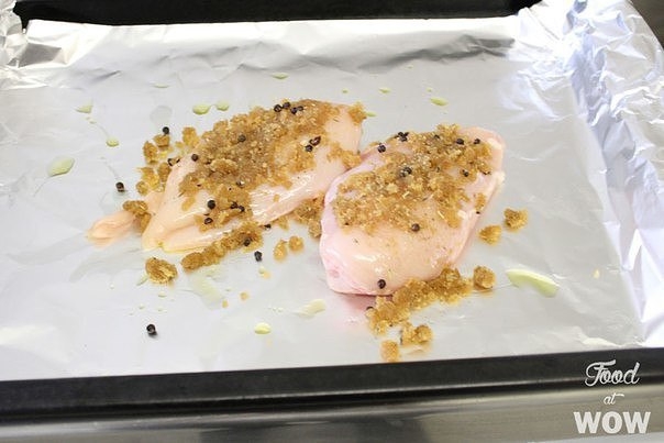 • Распределите смесь чеснока и коричневый сахар на куриные грудки.