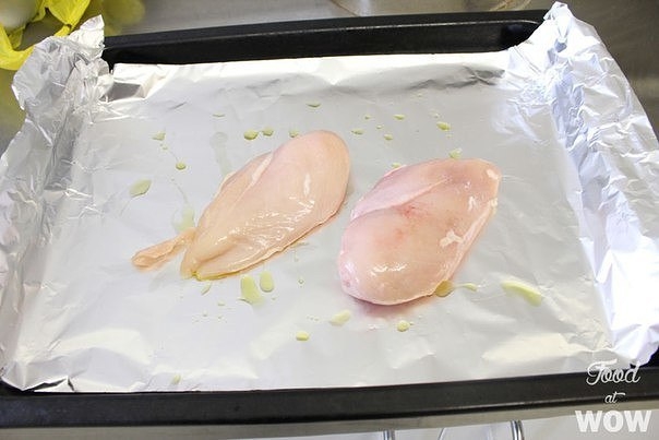 • Разогрейте духовку до 200 °С, поместите куриные грудки противень, предварительно смазанный маслом/покрытый фольгой/пергаментной бумагой.