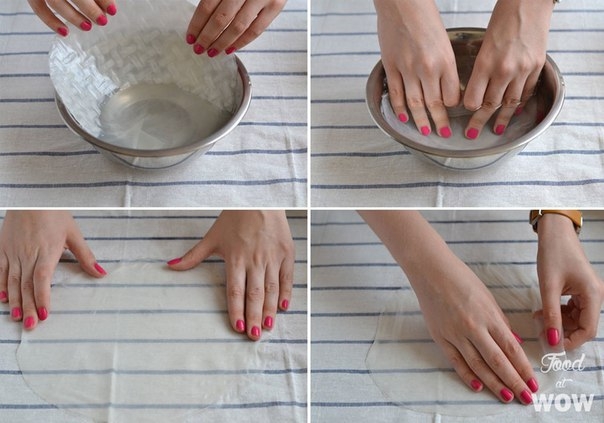 • Начинаем с размягчения рисовой бумаги: окуните два рисовых листа (или один) очень осторожно в воду и продержите ее там в течение примерно 1 минуты, пока листы полностью не размякнут. Положите рисовую бумагу на чистую ткань.