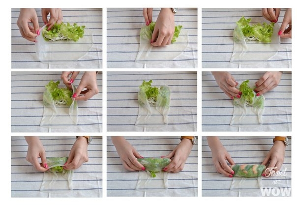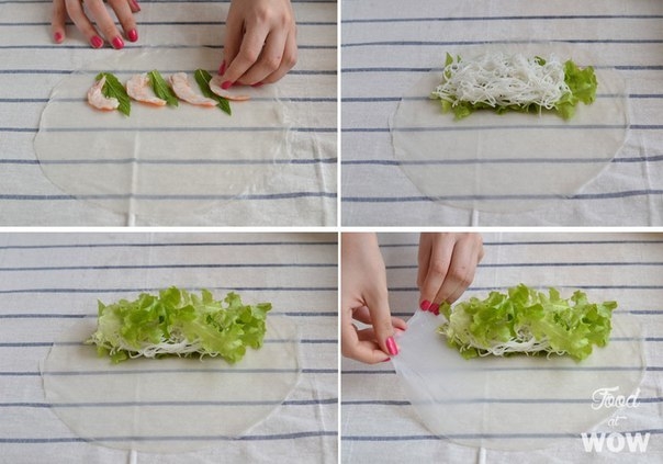 • Начинаем выкладывать начинку: около 4-х красивых листьев мяты, затем 4 половинки креветок, сверху листья салата, небольшую горсть вермишели и небольшую горсть бобовых ростков, затем дополнительно добавить листья мяты. В этот момент вы можете добавить буквально все, что есть в вашем холодильнике (думаю, кинзу, арахис, курицу, петрушку...). Теперь накрываем вторым листом салата. Обязательно по краю оставляем пустое пространство.