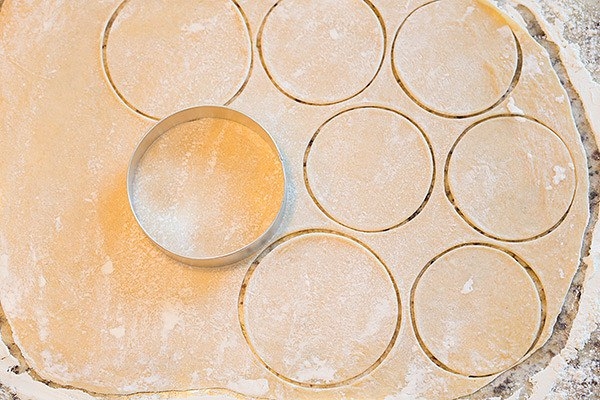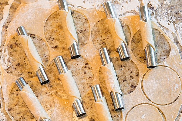 • Нагрейте большую сковороду до высокой температуры. Раскатайте тесто очень тонким слоем на хорошо посыпанной мукой поверхности. С помощью формы вырезать тесто кружочками. Сбрызните формы канноли разбрызгивателем, затем оберните тесто вокруг этой формы. Торцевые края смажьте немного белом для герметизации.