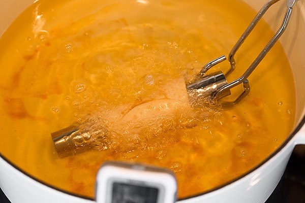• С помощью металлических щипцов аккуратно погрузите в масло и обжарьте до золотистого цвета и хрустящей корочки, около 1 - 2 минут.