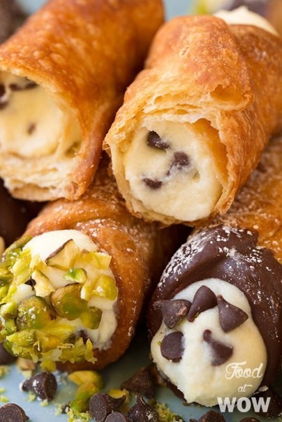 • В миске, используя резиновый или силиконовый шпатель, смешать вместе Рикотту и маскарпоне, добавьте сахарную пудру и шоколадную стружку. Накройте крышкой и охладите 30 минут. Перелейте в кондитерский мешок с большим круглым наконечником для заполнения оболочек.