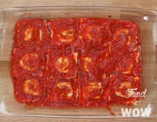 3/4 стакана пасты с соусом наливаем в форму для запекания. Затем положите половину замороженных пельменей в один слой над соусом и полейте оставшимся соусом и после этого все посыпьте сыром Моцарелла. Повторите слои еще раз, начиная с равиоли и посыпьте сыром Пармезан.