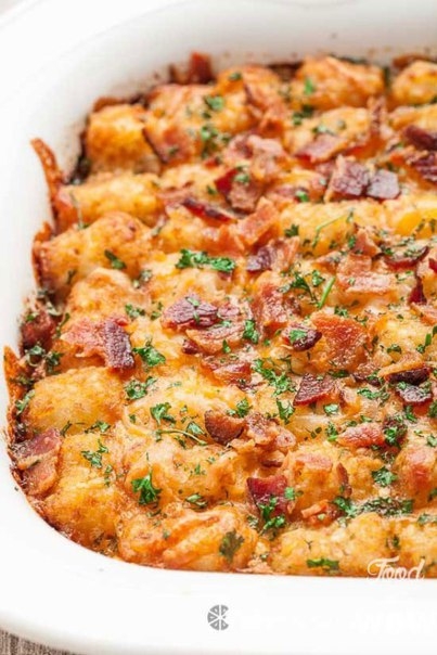 • В миске вручную взбейте вместе молоко, яйца, перец, луковый порошок и соль. После смешивания, полейте этой смесью сыр и колбасу в форме для запекания. Сверху выкладываем замороженные картофельные шарики.