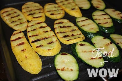◑ Поместите овощи на гриле (или в сковороде) и жарьте около 3 минут с каждой стороны, или пока мясо не станет мягким.