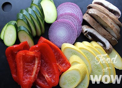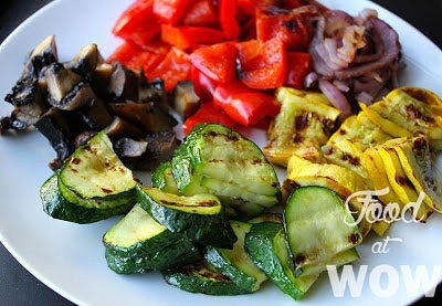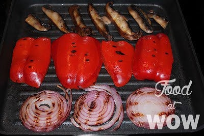 ◑ Снимите овощи с гриля и дайте остыть в течение 5 минут. Порезать овощи на гриле приблизительно 1 см части и отложите в сторону.
