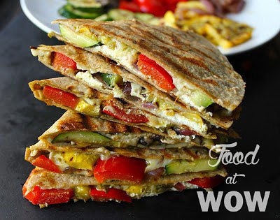 ЖАРЕНАЯ ОВОЩНАЯ КЕСАДИЛЬЯ С КОЗЬИМ СЫРОМ И СОУСОМ ПЕСТО.