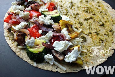 ◑ Для того чтобы собрать каждую кесадилью: расстилают тортилью с 1 ст.л. соуса песто. Посыпать ¼ стакана сыра Моцарелла на половину тортильи. Добавить ¼ часть овощей-гриль и покрошить над ними ~30 гр козьего сыра. Посыпать еще ¼ стакана Моцарелла сверху и сложить тортильи.