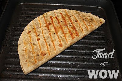 ◑ Кесадилью поместите на слегка смазанный маслом гриль (или сковороду-гриль) и готовьте в течение 3 минут с каждой стороны, пока сыр полностью не расплавился.