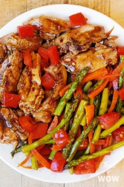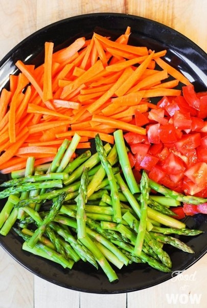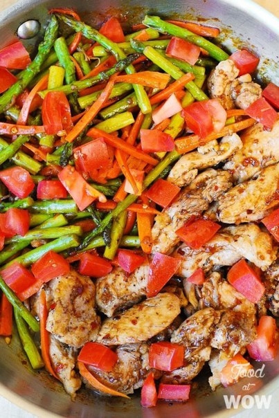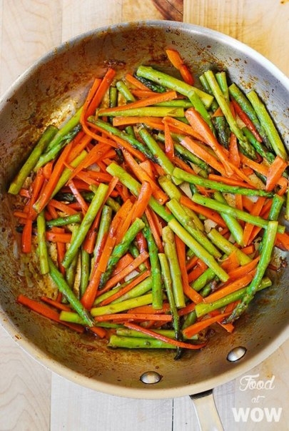 • В сковороду добавить спаржу и морковь. Готовить 3-4 минуты, перемешивая. Переложите к курице.