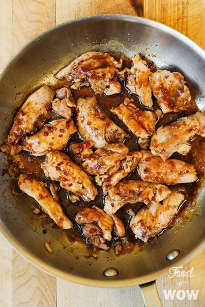• В большой сковороде разогрейте масло на среднем огне. Добавьте курицу; готовить в течение 5 - 6 минут с каждой стороны. Добавте в сковороду половину заправки, перемешайте с курией. Переложите курицу в тарелку и накройте крышкой.