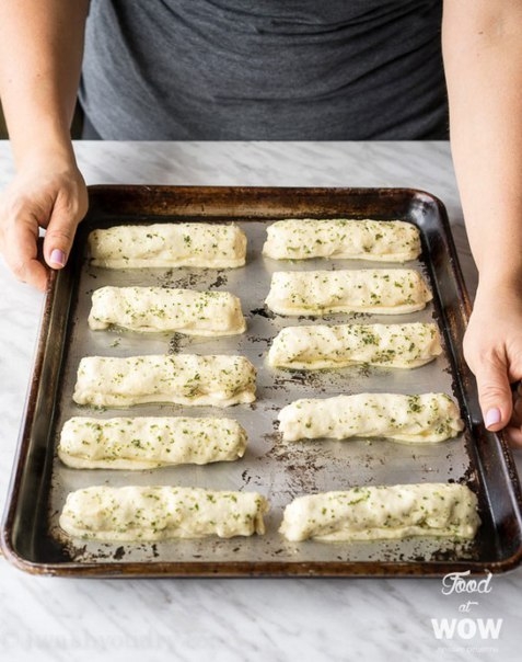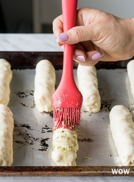 • Растопите сливочное масло и добавьте в него порошок чеснока и сушеную петрушку. Смажьте этой смесью рулетики.