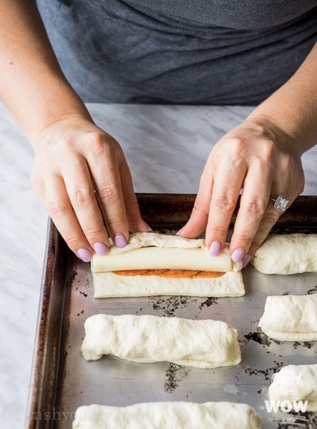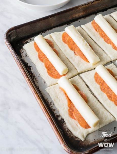 • Распределите по 4 ломтика пепперони на каждый прямоугольник теста и по брусочку сыра.