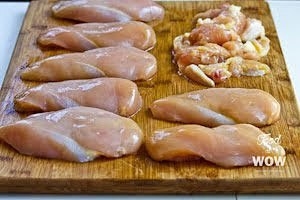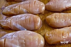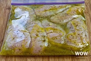 • Обрезать весь видимый жир из куриных грудок (если есть), сделайте небольшие крестообразные разрезы по всей длине каждого кусочка филе, чтобы маринад лучше пропитал ее. Положить курицу в один слой в мешок с застежкой.