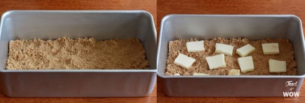 • Распределить коричневый сахар по дну формы для выпечки (если используете орехи, то выкладывайте их вместе с сахаром). Разложить на поверхности кусочки масла.