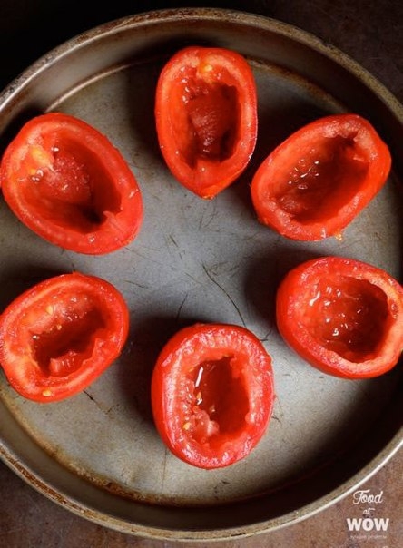 • Ложкой аккуратно убрать мякоть помидора. Разложить их на противне.
