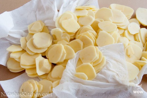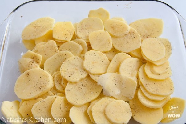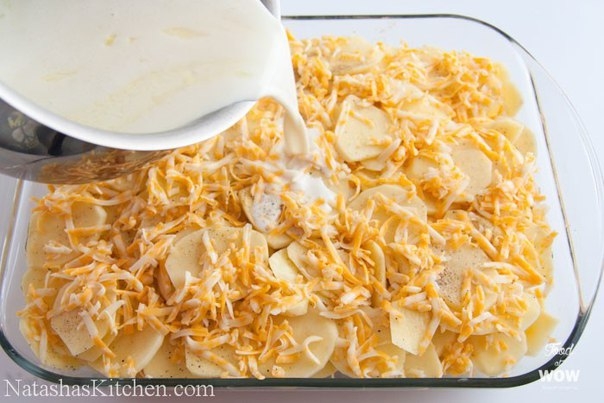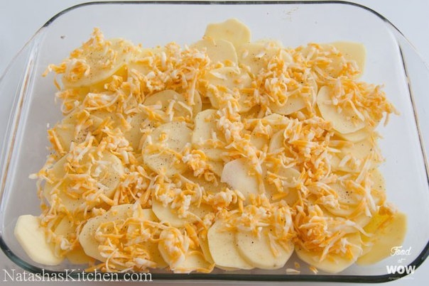 • Слейте воду с картофеля и промокните насухо бумажными полотенцами. Выложите половину картофеля в форму, приправьте солью и перцем, посыпьте половиной тертого сыра и затем выложите оставшийся картофель наверх, и повторите те же действия.