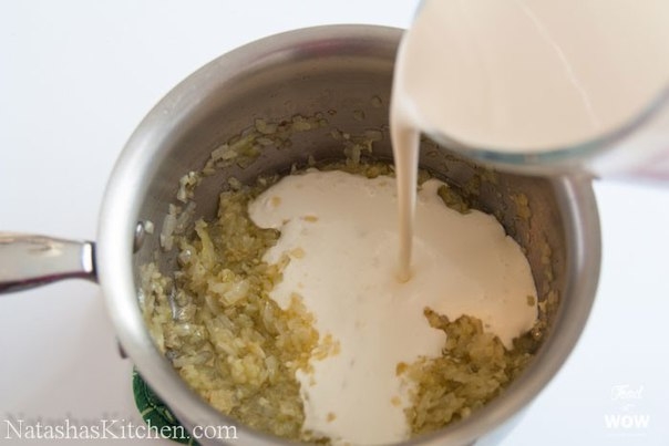• Вмешайте сливки и молоко. Доведите до кипения.