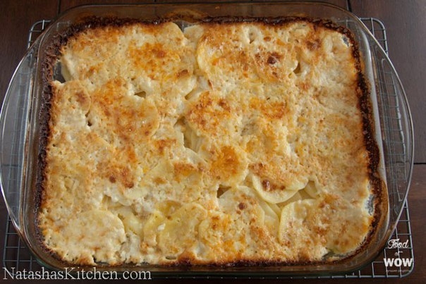 • Покрыть форму фольгой и выпекать на средней полке в духовке в течение 1 часа. Затем снимите фольгу и запекайте еще 30-45 минут, пока верх не подрумянится и большая часть жидкости не впитается в картофель. Картофель должен легко протыкаться вилкой.