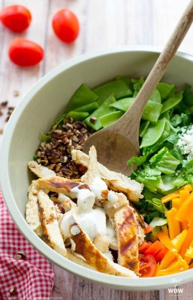 • В большую миску бросить листья салата, шпинат, помидоры, перец, стручковый горошек, апельсин, авокадо, орехи пекан, сыр Фета, курицу и перемешайте. Сбрызните дополнительно сверху салатнй заправкой и поперчите по вкусу.