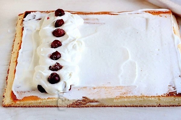Испеченный бисквит отделить от пергамента, слегка остудить, перевернуть, положить на новый лист пергамента и смазать кремом. На один край выложить вишню, как показано на фото.